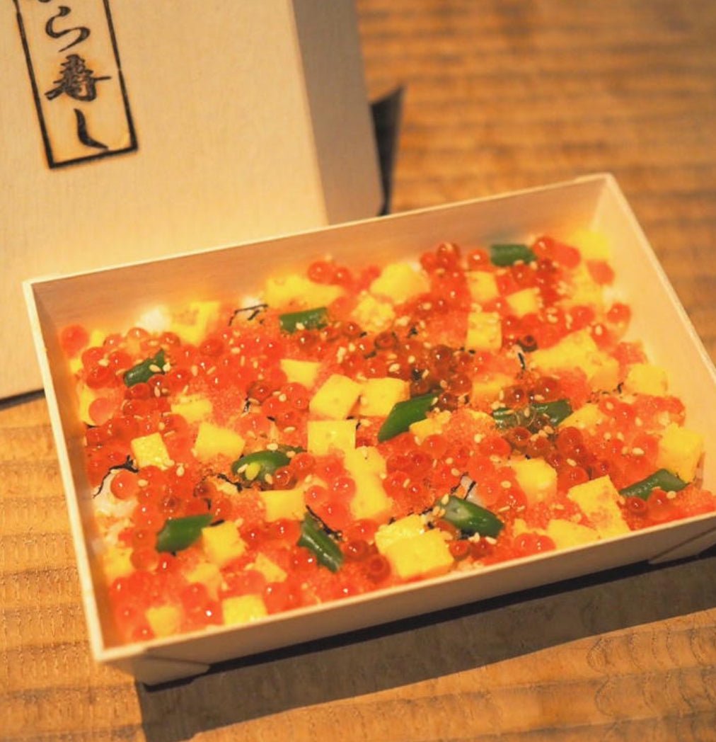 いくら、とびっこをふんだんに使用し、凍った宝石箱。玉子焼きにもこだわり“卵”も厳選。シャリの味、玉子焼きの甘み、塩味があるいくら、とびっこによりバランスよく仕上げ、シャリの上に刻みガリを乗せる事によりピリッとしたしまりもつけました。