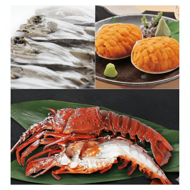 ◆商品内容:伊勢エビのボイル(1尾)500g前後/めひかり開き干し 8~10尾/うに貝焼き(30g)× 6個