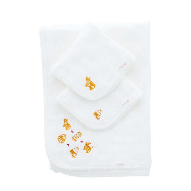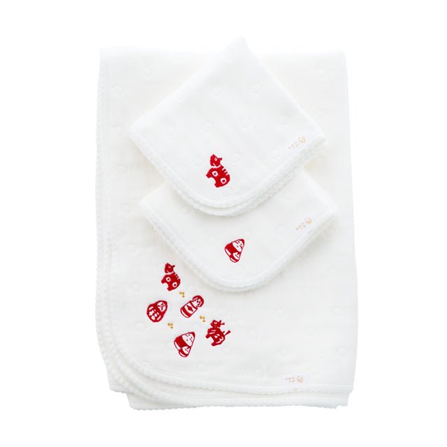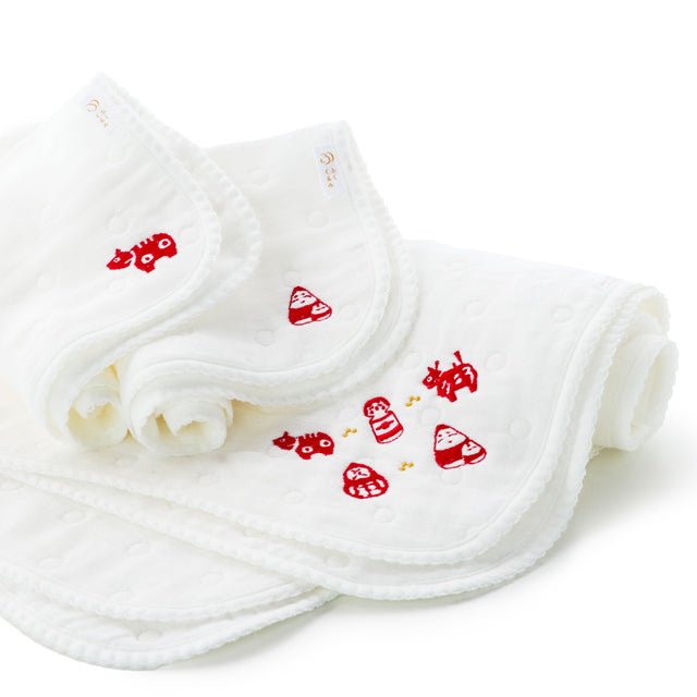 創業100年を超える老舗・丸栄ふとん店が、赤ちゃんと福島の未来への想いを込めて開発したコットンギフト。「ふくくるみ(福を包む)」という名前の通り、赤べこやこけし、起き上がり小法師など、福島の縁起物をモチーフにした刺繍を施しました。やさしいコットン素材が赤ちゃんをふんわりと包み込み、お母さんの手のような温もりを届けます。出産祝いはもちろん、福島土産としても喜ばれる逸品です。見て、触れて、福を感じる——福島の想いが詰まった特別なギフトです。