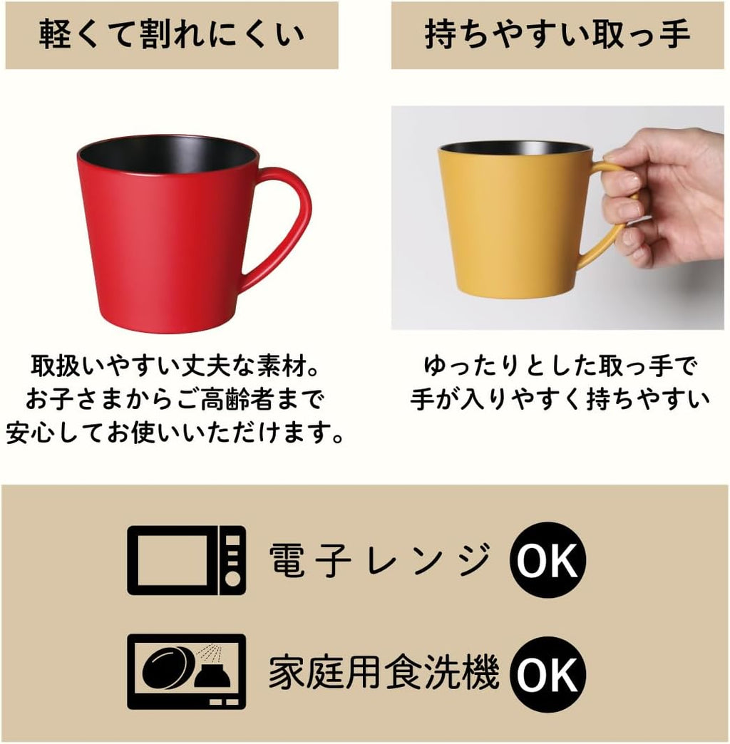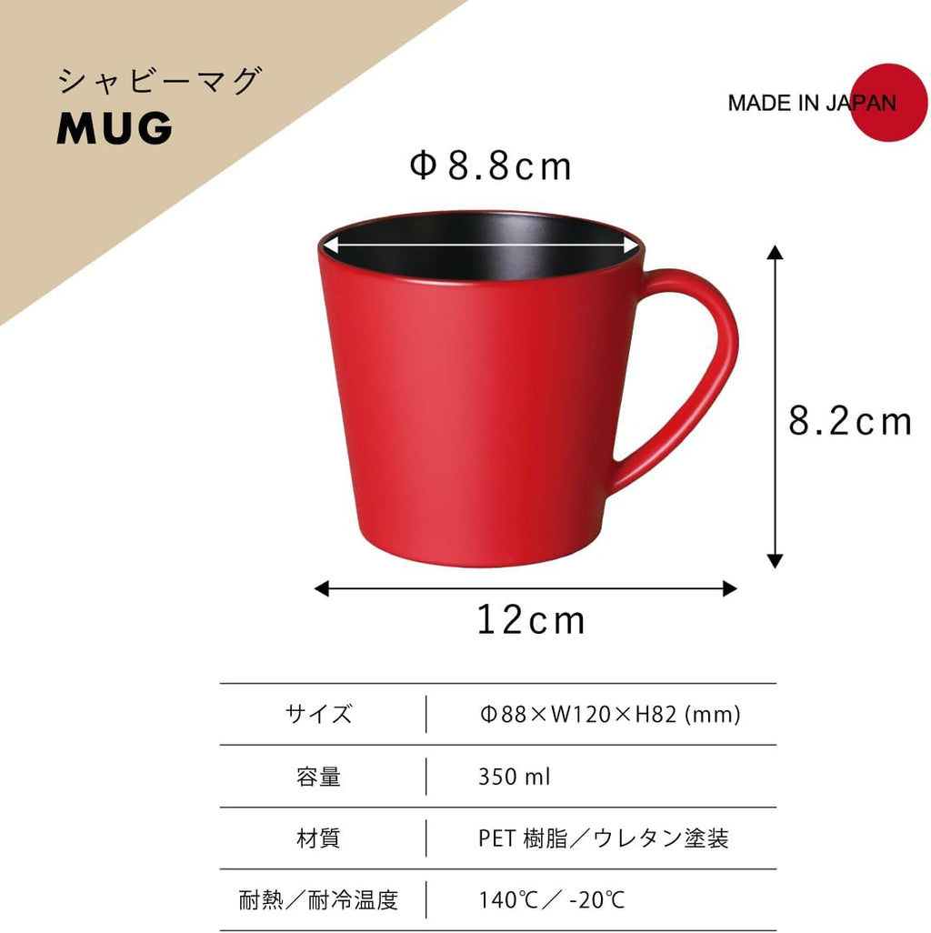 Sha美はプラスチック製の会津漆器。伝統工芸品としての良さを残しつつ、樹脂ならではの柔軟な加工性や使いやすさを活かし、日常的な暮らしに寄り添うアイテムをお届けします。フチが薄く口当たりがやさしいマグ。飽きのこないシンプルなフォルムで長くご愛用いただけます。